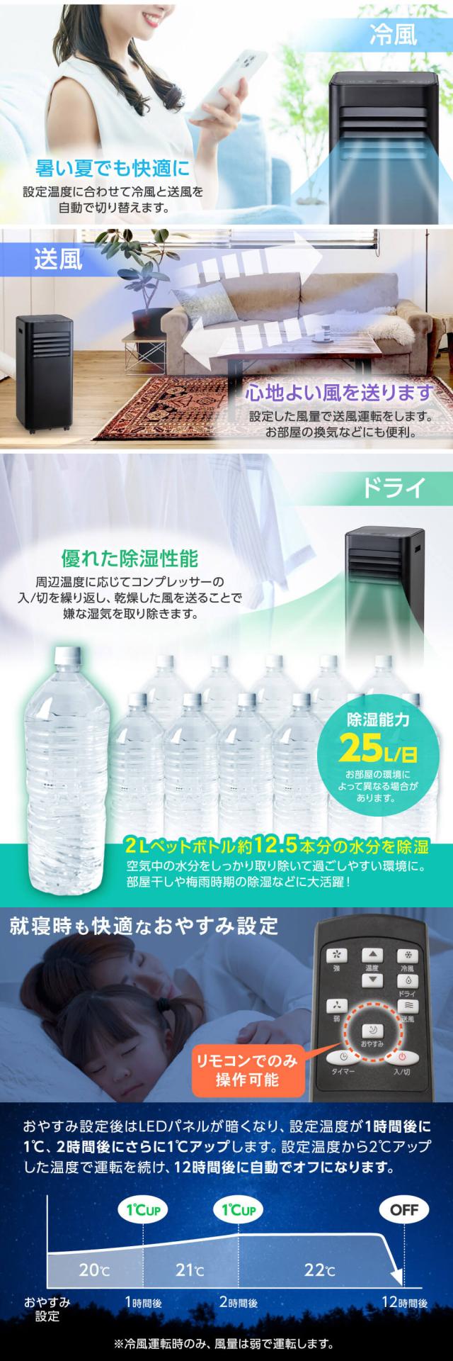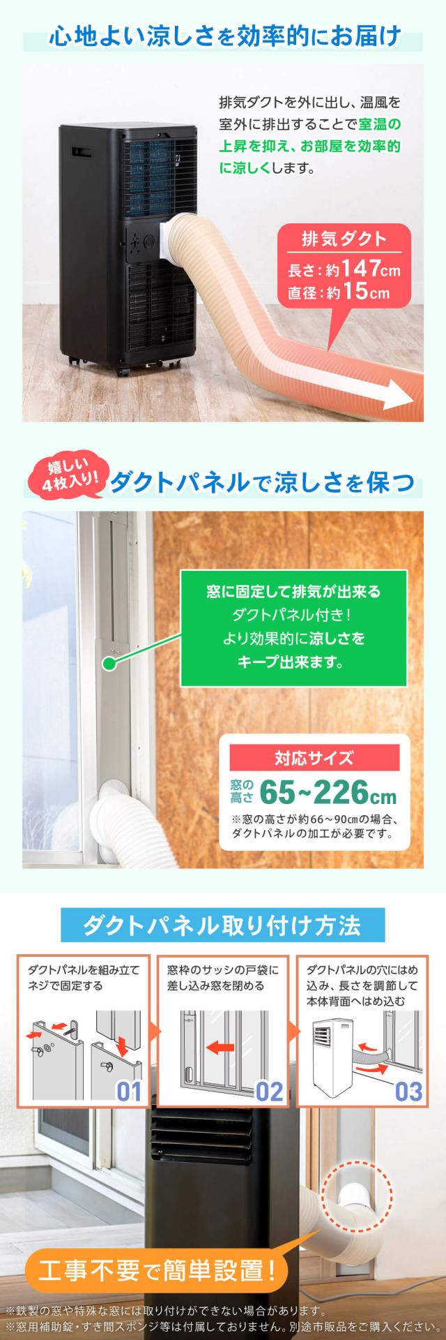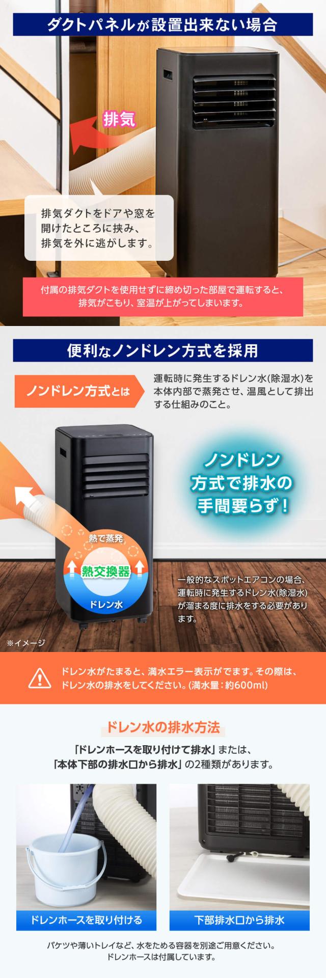 * 付属品:リモコン、ドレンホース、排気ダクト、ダクトエンド、排気ノズル、ダクトパネル固定用ネジセット、ダクトパネルセット